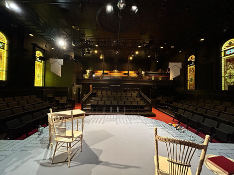 This set was so much fun to put together. Designed by Lynne Porter, the set focused on words and how they make up everything. This highlighted one of the plays main messages: words are powerful. Everything was cut from 1/4" Masonite that we had in stock. The guillotine was reinforced with 2x4's we had in stock to avoid buying any wood. Since there were so many words on the set, to save time Lynne and I decided to use magic markers instead of paint. I organized volunteer called to help, especially with the stage floor. Guillotine Blades were also hung from our catwalk above the house right and house left sections using airline cable, chains, and d-rings. To test the placement of the blades, especially since it blocked part of the stage from the booth, I cut them out of cardboard first and hung them using tie-line.